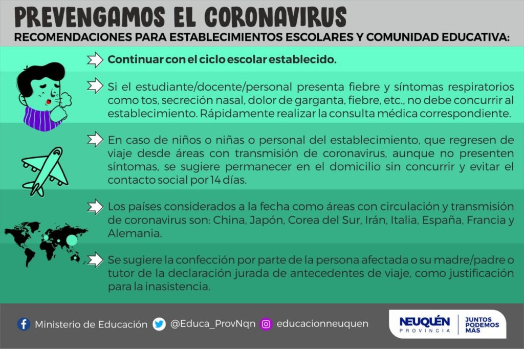 Prevengamos el Coronavirus | Recomendaciones para la comunidad educativa10 de marzo de 2020Neuquén, 09 de marzo del 2020.-Prevengamos el Coronavirus | Recomendaciones para la comunidad educativa:Desde el Ministerio de Educación de la provincia del Neuquén y el Consejo Provincial de Educación, compartimos algunas recomendaciones para establecimientos escolares y personal de Educación, para poder tenerlas en cuenta en función de la situación epidemiológica actual.——CONTACTOS ANTE EMERGENCIA O CONSULTAS:⏺ES IMPORTANTE QUE ANTE CUALQUIER EMERGENCIA COMUNICARSE AL 107.⏺PARA CUALQUIER CONSULTA O SOSPECHA DE SÍNTOMAS EL GOBIERNO DE LA PROVINCIA DEL NEUQUÉN A PUESTO A DISPOSICIÓN LA LÍNEA 0800-333-1002 QUE CUENTA CON PERSONAL CAPACITADO LAS 24 HS DEL DÍA PARA ASESORAR O DERIVAR CADA SITUACIÓN.—Recomendaciones para la prevención de enfermedades respiratorias. En este sentido es importante:-Estimular una adecuada higiene de manos: mediante el lavado frecuente con agua y jabón por 20 segundos, y si no es posible, la utilización de soluciones a base de alcohol (alcohol en gel).Es especialmente importante el lavado de manos: antes y después de manipular basura o desperdicios; antes y después de comer, manipular alimentos y/o amamantar; luego de haber tocado superficies públicas: mostradores, pasamanos, picaportes, barandas, etc.; después de manipular dinero, llaves, animales, etc.; después de ir al baño o de cambiar pañales.-Realizar una adecuada higiene respiratoria: La higiene respiratoria refiere a las medidas de prevención para evitar la diseminación de secreciones al toser o estornudar. Cubrirse la nariz y la boca con el pliegue interno del codo o usar un pañuelo descartable al toser o estornudar. Usar el cesto de basura más cercano para desechar los pañuelos utilizados. Limpiar las manos después de toser o estornudar.-Desinfectar superficies: La contaminación de superficies y objetos es una de las vías más frecuentes de transmisión de las infecciones respiratorias. Se recuerda que diversas superficies deben ser desinfectadas regularmente para minimizar el riesgo de transmisión por contacto: mostradores, barandas, picaportes, puertas, etc. La desinfección debe realizarse diariamente y esta frecuencia depende del tránsito y de la acumulación de personas, la época del año y la complementación con la ventilación de ambientes.Antes de aplicar cualquier tipo de desinfectante debe realizarse la limpieza de las superficies con agua y detergente. Esta limpieza tiene por finalidad realizar la remoción mecánica de la suciedad presente.-Ventilar de ambientes: La ventilación de ambientes cerrados, sobre todo en período invernal o de bajas temperaturas debe hacerse con regularidad para permitir el recambio de aire.—Por último adjuntamos material informativo para difundir entre personal, estudiantes y familias.Ministerio de Educación – Consejo Provincial de Educación de la provincia del Neuquén. (Fuente: Ministerio de Salud de la provincia del Neuquén).-CORONAVIRUS AFICHECORONAVIRUS AFICHE 2SARAMPIÓN AFICHE 1SARAMPIÓN AFICHE 2SARAMPIÓN AFICHE 3DENGUE AFICHE 1DENGUE AFICHE 2DENGUE AFICHE 3