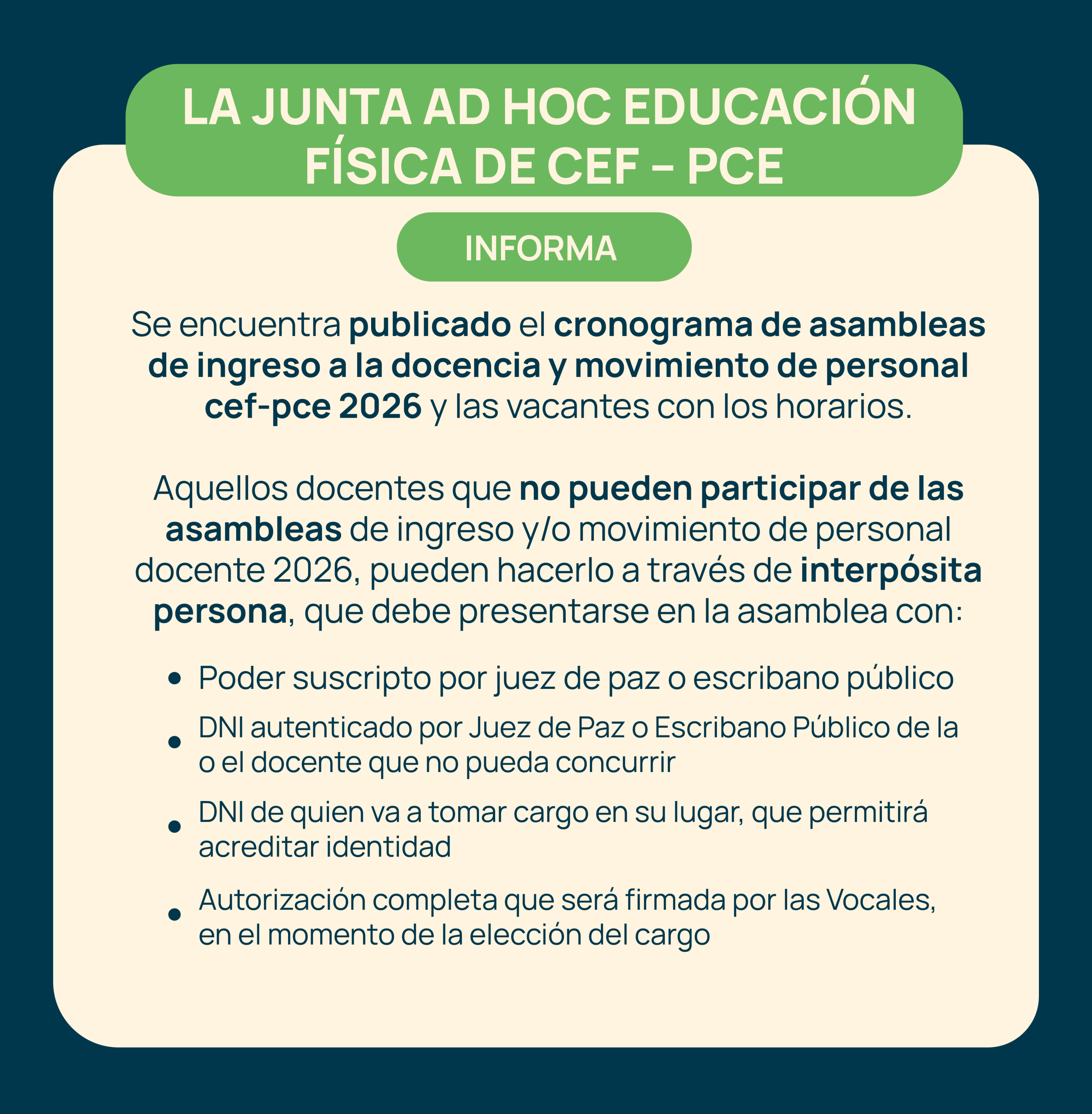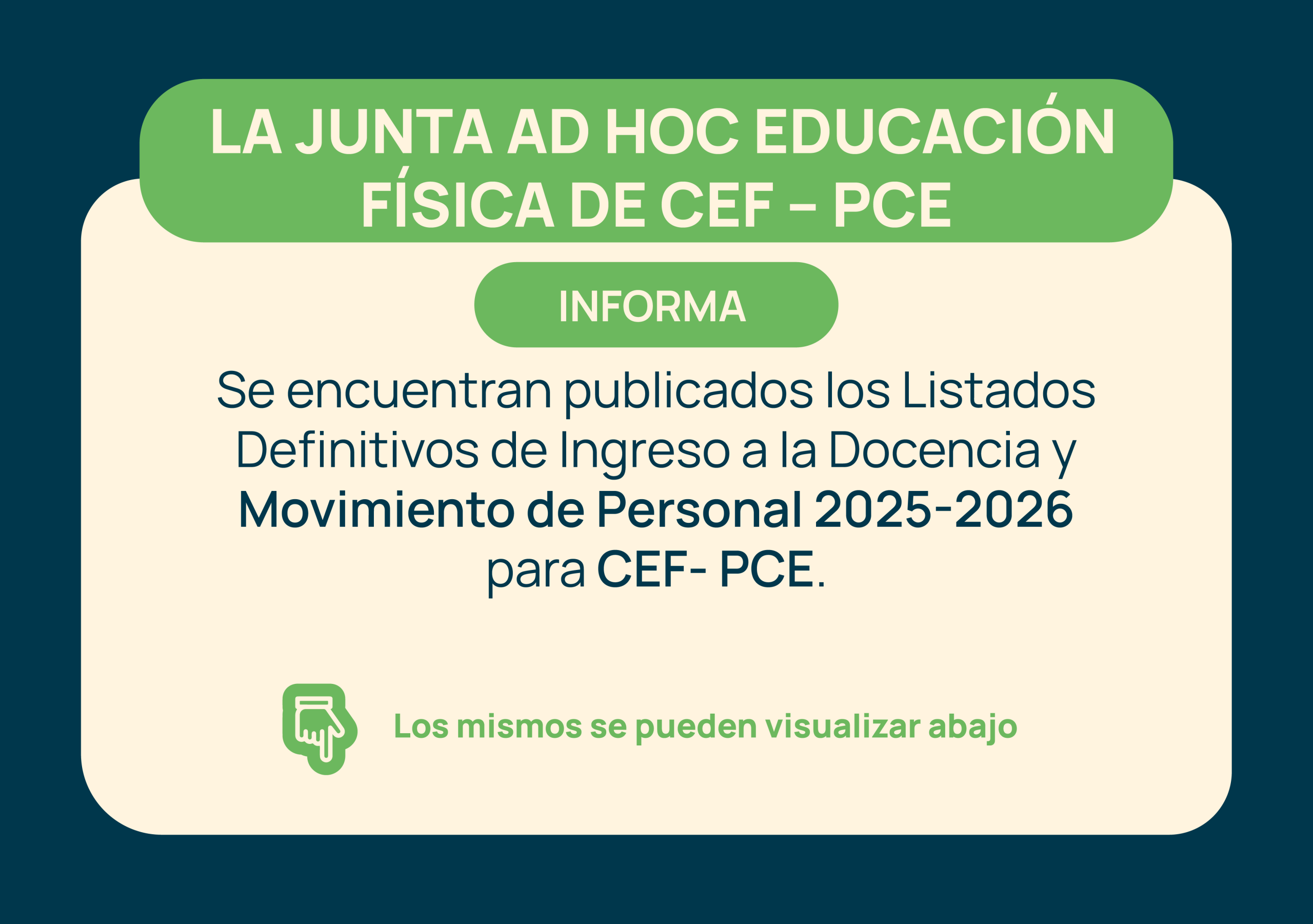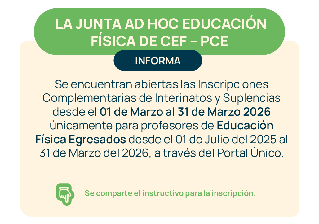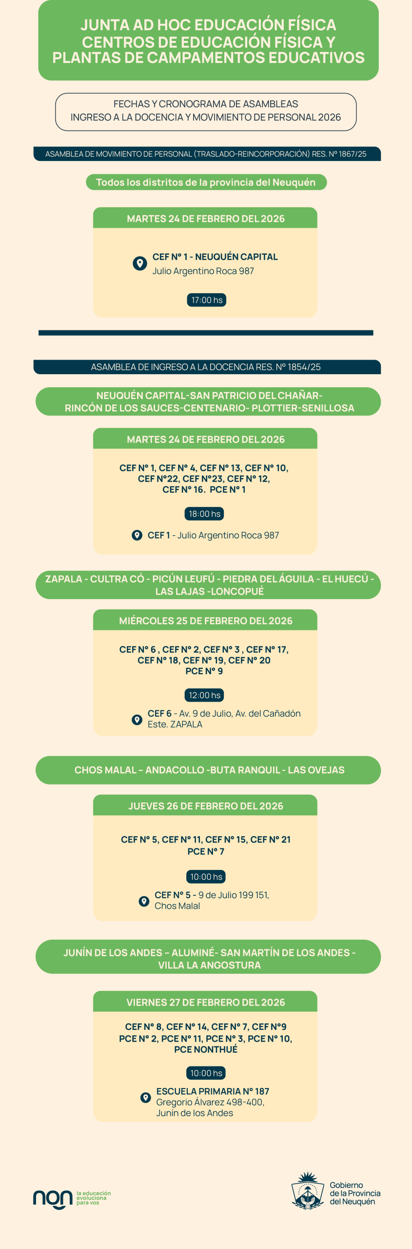 Junta Ad Hoc Educación FísicaIntegrantesProf. Guadalupe BlancoPresidentaProf. Liliana Graciela AguayoSecretaria Vocales Prof. Patricia Bugallo Prof. Andrés Mauro Javier Prof. Héctor Edgardo Casal Prof. María Cecilia Russo Vocal · Poder EjecutivoContactoTeléfono: 0299-155660575Correo: juntaadhocedufisica@neuquen.gov.ar CEF Nº 1 – Roca 987NOVEDADES 2026INSTRUCTIVO:INSTRUCTIVO-INSCRIPCION-LISTADO-COMPLEMENTARIO-ANO-2026-CEF-y-PCE La Junta Ad-Hoc de Educación Física para CEF y PCE informa: 12 de febrero de 2026Documento a imprimir para certificar por Juez de Paz o Escribano Público:Autorizacion para toma de cargo en Asamblea 2026 CRONOGRAMA ASAMBLEAS INGRESO Y MOVIMIENTOS CEF-PCE 2026VACANTES con Horarios – Ingreso a la Docencia y Movimiento de Personal CEF-PCE 2025- 2026 11 de febrero de 2026LISTADOS:LISTADO DEFINITIVO – PROFESOR CEF – INGRESO A LA DOCENCIA – 2026 LISTADO DEFINITIVO – PRECEPTOR CEF- INGRESO A LA DOCENCIA – 2026 LISTADO DEFINITIVO – PROFESOR CEF – MOVIMIENTO DE PERSONAL – TRASLADO- 2026 LISTADO DEFINITIVO- PROFESOR PCE – MOVIMIENTO DE PERSONAL – REINCORPORACION 2026 LISTADO DEFINITIVO – DIRECTOR CEF – MOVIMIENTO DE PERSONAL – TRASALADO- 2026 04 de febrero de 2026La Junta Ad-Hoc de Educación Física para CEF y PCE informa:LISTADOS:Listado Provisorio – DIRECTOR – Movimiento TRASLADO CEF-PCE 2026 Listado Provisorio – PROFESOR – Movimiento Traslado CEF-PCE 2026 Listado Provisorio – PRECEPTOR – Ingreso a la Docencia CEF-PCE 2026 Listado Provisorio – PROFESOR – Ingreso a la Docencia CEF – PCE 2026 28 de enero de 2026La Junta Ad-Hoc de Educación Física para CEF y PCE informa:Se encuentran publicados los Listados Definitivos de Interinatos y Suplencias 2026 para CEF- PCE y AATD con vigencia a partir del 20 de enero 2026.LISTADO DEFINITIVO INTERINATOS Y SUPLENCIAS 2026 – PRECEPTORLISTADO DEFINITIVO INTERINATOS Y SUPLENCIAS 2026 – PROFESORLISTADO DEFINITIVO INTERINATOS Y SUPLENCIAS 2026 – REGENTELISTADO DEFINITIVO INTERINATOS Y SUPLENCIAS 2026 – VICEDIRECTORLISTADO DEFINITIVO INTERINATOS Y SUPLENCIAS 2026 – DIRECTORLISTADO DEFINITIVO INTERINATOS Y SUPLENCIAS 2026 – AATD NOVEDADES 2025La Junta Ad-Hoc de Educación Física para CEF y PCE informa: Se encuentran publicadas las Nóminas de Vacantes y Resoluciones de Ingreso a la Docencia y Movimiento de Personal de CEF y PCE 2025 Resolución N° 1867-2025 MOVIMIENTO DE PERSONAL 2025Nómina Vacantes Movimiento de Personal 2025Resolución N° 1854-2025 INGRESO A LA DOCENCIA 2025Nómina Vacantes Ingreso a la Docencia 2025 Instructivo-Ingresos-y-Movimiento-del-personal-CEF-y-PCE-2025 Listado Provisorio Interinatos y Suplencias 2026 – AATDListado Provisorio Interinatos y Suplencias 2026 – DirectorListado Provisorio Interinatos y Suplencias 2026 – Vice DirectorListado Provisorio Interinatos y Suplencias 2026 – RegenteListado Provisorio Interinatos y Suplencias 2026 – PreceptorListado Provisorio Interinatos y Suplencias 2026 – ProfesorListado Definitivo Supervisores Año 2025La Junta Ad-Hoc de Educación Física para CEF y PCE informa:Se encuentra publicado el Listado Provisorio para cubrir los Cargos de Supervisores para CEF y PCE con periodo de reclamo desde el 21/08/2025 al 27/08/2025 inclusive, a través del Portal Único.Listado Provisorio Supervisor 2025 Resolucion 1094-2025 cargo Supervisores CEF – PCEInstructivo para Inscripcion a Cargos Supervisores CEF-y-PCE-2025La Inscripción para Interinatos y Suplencias 2026 de se extiende hasta el 20 de Julio Inclusive. INSTRUCTIVO CEF-PCE 2026 POR DISTRITO Listado Definitivo Complementarias CEF- PCE 2025 PRECEPTORListado Definitivo Complementarias CEF – PCE 2025 PROFESOR Listado Provisorio Complementario 2025- PreceptorListado Provisorio Complementario 2025- Profesor08 de abril de 2025NOMINA DE CARGOS Y HORARIOS DE INGRESO A LA DOCENCIA Y MOVIMIENTO DE PERSONAL PARA CEF Y PCE 2025Nomina-Movimiento CARGOS – cef-y-pce 2025 CPE wordNomina de cargos y horarios ingreso CEF y PCE 2025 INSTRUCTIVO-INSCRIPCION-LISTADO-COMPLEMENTARIO-AÑO-2025-CEF-y-PCE COMUNICACIÓN IMPORTANTEAquellos docentes que no pueden participar de las Asambleas de Ingreso y/o Movimiento de Personal Docente 2025, pueden hacerlo a través de interpósita persona, que debe presentarse en la asamblea con:Poder suscripto por Juez de Paz o Escribano PúblicoDNI autenticado por Juez de Paz o Escribano Público de la o el docente que no pueda concurrirDNI de quien va a tomar cargo en su lugar, que permitirá acreditar identidadAutorización completa que será firmada por las Vocales, en el momento de la elección del cargoDocumento a imprimir para certificar por Juez de Paz o Escribano Público: Autorizacion-para-toma-de-cargo-202520 de febrero de 2025Listados Definitivo de Ingreso y Movimiento de personal 2025 para CEF y PCELISTADO DEFINITIVO DE MOVIMIENTO DE PERSONAL 2025. (TRASLADO)LISTADO DEFINITIVO INGRESO A LA DOCENCIA 2025. PRECEPTORLISTADO DEFINITIVO INGRESO A LA DOCENCIA 2025 PROFESOR.18 de febrero de 2025 LISTADO DEFINITIVO VICEDIRECTOR INTERINATOS Y SUPLENCIAS 2025LISTADO DEFINITIVO REGENTE INTERINATOS Y SUPLENCIAS 2025LISTADO DEFINITIVO PROFESOR INTERINATOS Y SUPLENCIAS 2025LISTADO DEFINITIVO PRECEPTOR INTERINATOS Y SUPLENCIAS 2025LISTADO DEFINITIVO AATD INTERINATOS Y SUPLENCIAS 2025LISTADO DEFINITIVO DIRECTOR INTERINATOS Y SUPLENCIAS 2025 LA JUNTA AD HOC EDUCACION FISICA INFORMA:«A partir del día viernes 7 de febrero hasta el día martes 11 de febrero los docentes, que se inscribieron para movimiento de personal 2025 para CEF y PCE podrán anexar la documentación según resolución 1812/24.Art. 4: Que los docentes que fundamentan su solicitud de traslado en razones de salud, deberán acompañar un certificado médico y si la causal fuera por integración de núcleo familiar, deberán adjuntar la documentación que avale el desempeño laboral del cónyuge y el certificado de domicilio expedido por autoridad policial en los términos d