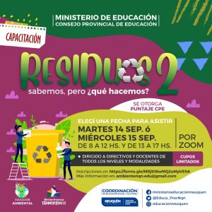 El ministerio de Educación, a través de la dirección provincial de Programas Transversales de la Coordinación de Educación Social y Cultural invita equipos directivos y docentes de todos los Distritos Escolares de la provincia, a ser parte de la  segunda cohorte de la capacitación docente “Residuos: Sabemos, pero ¿qué hacemos?”, organizada por el equipo provincial de Educación Ambiental.