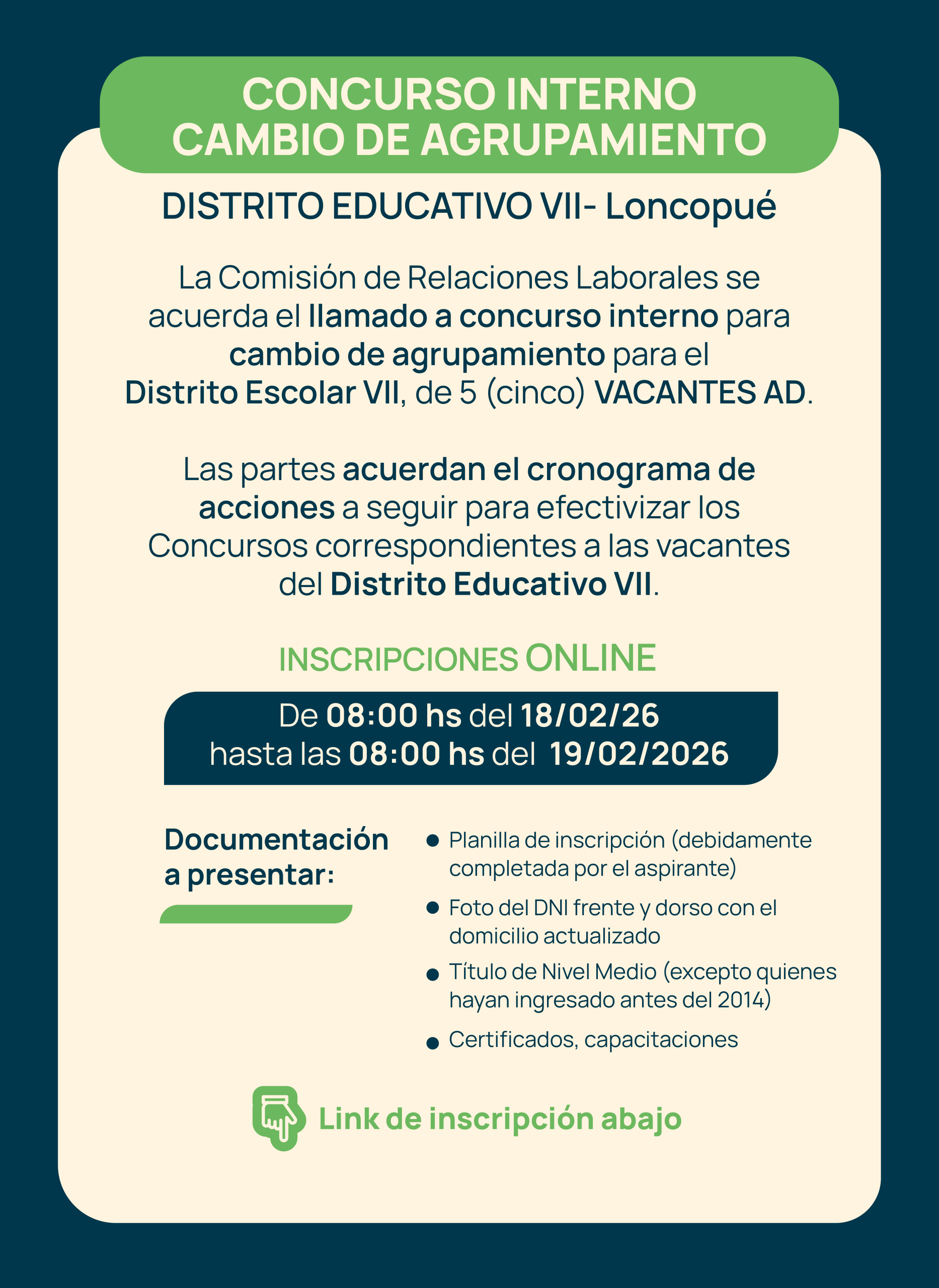 Concurso Interno del CPENOVEDADES 2026 PROCESO DE EVALUACION DEL C.T.E.: El Proceso se efectuará en lugar y fecha a determinar con la constitución del CTE y llevando adelante las etapas que éste determine.Los postulantes recibirán un mail en el que se les comunicará la admisión o no para el presente Concurso.Se publicarán los documentos admitidos en sitio oficial del CPESe determinan los requisitos a cumplir, que consiste en:Agentes con domicilio en establecimientos educativos dependientes del Distrito VII. Teniendo en cuenta que el cumplimiento efectivo de sus funciones como Administrativos (AD) será en la sede del distrito, de la localidad de Loncopue.Personal bajo Convenio Colectivo de Trabajo, con efectiva prestación de servicios en el Consejo Provincial de Educación con un mínimo de 13 meses en el cargo como Planta Permanente;Personal que pertenezcan a un Agrupamiento distinto de Administrativo (AD);Personal que se encuentre activo (prestando servicios) al momento de inscripción del concurso;Personal que no se encuentren con Sumario Administrativo en Trámite o cumpliendo con sanciones disciplinarias y/o inhabilitados por tramitación de sumario con efecto negativo;Deberán poseer evaluaciones de desempeño (Periodo 2024 y 2025), las que deberán ser positivas en cada periodo;No poseer licencias acumuladas por más de 120 días en los últimos dos años. Por otra parte, el COMITÉ TÉCNICO EVALUADOR acuerda el siguiente cronograma, para llevar adelante el mencionado concurso:El 23/02/2026 se evaluará la documentación presentada por cada postulante, el 26/02/2026 se publicará el listado de postulantes.El día 02/03/2026 se recibirán las impugnaciones.Para el día 04/03/2026 se publicará el listado de admitidos definitivo.El día 09/03/2026 se llevará a cabo una nivelación para los postulantes admitidos. Material de consulta para CONCURSO INTERNO POR CAMBIO DE AGRUPAMIENTO:Se hace saber a los interesados que por ACTA 082/22 se define el material de consulta para los concursos próximos a realizarse.Se establece la metodología de examen en dos instancias: una teórica y una práctica.TEÓRICA: múltiple opciónPRÁCTICA: Manejo de archivos Word y Excel. Material Ley 3487 CCT Anexo UnicoLEY 3002 notificacion electronicaLey 3400 CCT-texto ordenadoFormulario de inscripción- concursos cambio agrup Anexo Bd_1449_00 método de redacciónSistema de Recursos Humanos RH ProNeuCircular- modeloMemorandum – modeloNota Múltiple – modeloNota Solicitud Exte. – modeloEPCAPP-ESTATUTO DEL PERSONAL CIVIL DE LA ADMINISTRACION PUBLICA PROVINCIALTutorial Herramientas informáticasEstatuto DocenteLey 1284Ley 2890 y EPCAPP_ ResumenLey2890_CCT CPELey_0242Régimen Licencias Justificaciones Franquicias -20 de febrero de 2026 Link de inscripción : https://forms.gle/MRnwHaXUiPRct4xq6 -13 de febrero de 2026NOVEDADES 2025Concurso Interno – Cambio de agrupamiento Distrito Escolar XI – Alumine – Acta Nº 122/2025 del CTESe comunica que habiendo finalizado todas las etapas del concurso interno y que el mismo se encuentra con la aprobación de lo actuado por el CTE conforme al Acta Nº 080/25 de la Comisión de Relaciones Laborales del CCT – Ley 3487, se procede a listar a continuación, los postulantes en orden de mérito según la calificación final obtenida.Orden InicialDNINro Puntaje TotalPostulante1134634139682,00630144587579,50838204663378,00930518829273,001040182943171,00234125173462,00Concurso Interno – Cambio de agrupamiento Distrito Escolar XI AlumineMediante Acta Nº 117/2025 del Comité Técnico Evaluador del “Concurso Interno para cubrir cargo administrativo”, se comunica que habiendo concluido el proceso de “impugnación”, se da a conocer el listado de documentos Admitidos “definitivo” a participar del mismo.DNI341251733014458738204663305188294018294334634139Los participantes admitidos deberán presentarse el día Lunes 25/08/25 a partir de las 10:00 hs al proceso de “Nivelación” y el día Jueves 28/08/25 al proceso de “Oposición” (examen teórico-práctico) en las instalaciones del Distrito Escolar XI a partir de las 10:00 hs.Se les recuerda que podrán disponer el día del examen del material impreso como consulta. No está permitido el uso de celulares u otros dispositivos electrónicos.Concurso Interno – Cambio de agrupamiento Distrito Escolar XI AlumineMediante Acta Nº 109/2025 del Comité Técnico Evaluador del Concurso Interno para cubrir cargos administrativos, se da a conocer el listado de documentos Admitidos “provisorios” a participar del mismo.DNI341251733014458738204663305188294018294334634139Concurso Interno – Cambio de agrupamiento Distrito Escolar V – Chos Malal – Acta Nº 106/2025 del CTESe comunica que habiendo finalizado todas las etapas del concurso interno y que el mismo se encuentra con la aprobación de lo actuado por el CTE conforme al Acta Nº 079/25 de la Comisión de Relaciones Laborales del CCT – Ley 3487, se procede a listar a continuación, los postulantes en orden de mérito según la calificación final obtenida.Orden InicialDNINro Puntaje TotalPostulante9361519041852340020123821312034654801031203311577431805260674832222410274CONCURSO INTERNO – CAMBIO DE AGRUPAMIENTO DISTRITO ESCOLAR XI – AlumineLa Comisión de Relaciones Laborales se acuerda el llamado a concurso interno para cambio de agrupamiento para el Distrito Escolar XI, de 5 (cinco) VACANTES AD.Las partes acuerdan el cronograma de acciones a seguir para efectivizar los Concursos correspondientes a las vacantes del Distrito Escolar XI.INSCRIPCIONES Online: Desde las 08:00 horas del día 05/08/25 hasta las 08:00 horas del día 06/08/2025. En el siguiente link:https://docs.google.com/forms/d/e/1FAIpQLScozQudWy1_G19H2SIoJjNF0j–RUa1UVdwmpmWsx6WThgIWQ/viewformLa documentación a presentar será:Planilla de inscripción (debidamente completada por el aspirante);Foto del DNI frente y dorso con el domicilio actualizado;Título de Nivel Medio (e