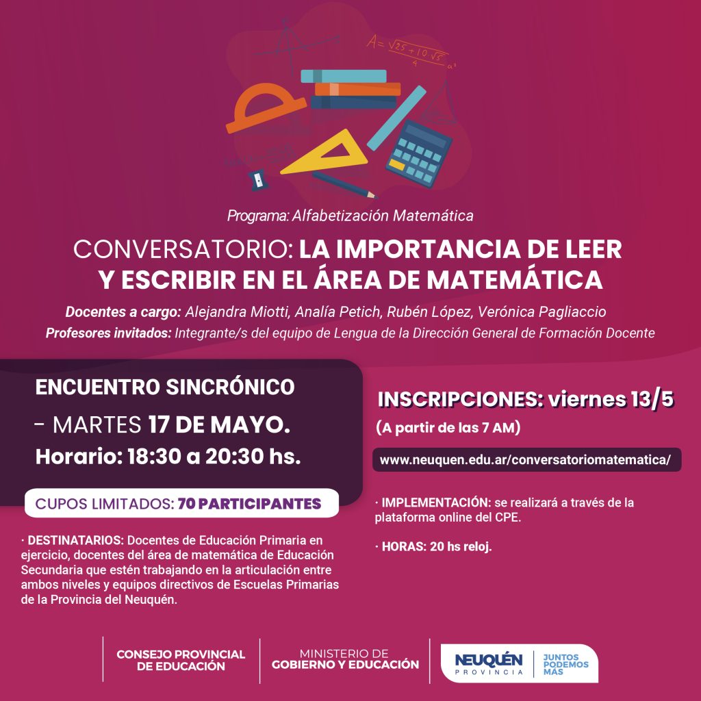Objetivos: Reflexionar sobre las prácticas de enseñanza de la matemática a partir de problematizar la complejidad de la lectura del área. Reconocer el valor formativo y de producción de la escritura en el área de matemática. Reflexionar sobre las dificultades en la lectura, producción e interpretación de textos escritos en matemática.