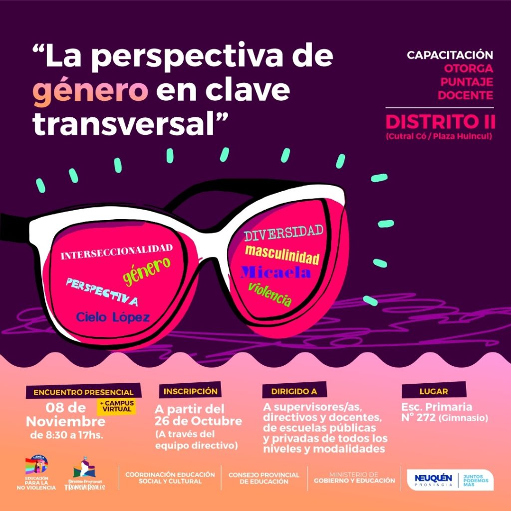 EDUCACIÓN: ESTÁN ABIERTAS LAS INSCRIPCIONES PARA CAPACITACIÓN SOBRE PERSPECTIVA DE GÉNERO27 de octubre de 2022 El trayecto formativo está destinado a docentes, equipos directivos y supervisivos pertenecientes al Distrito II. El ministerio de Gobierno y Educación y el Consejo Provincial de Educación, a través de la dirección provincial de Programas Transversales de la Coordinación de Educación Social y Cultural invitan a la comunidad educativa del Distrito Escolar II a participar de la capacitación docente “La perspectiva de género en clave transversal”.El trayecto está dirigido a supervisoras y supervisores, equipos directivos y docentes de escuelas públicas y privadas de todos los niveles y modalidades del Distrito II (Cutral Có y Plaza Huincul).La presidenta del CPE, Ruth Flutsch, destacó que “estas instancias de formación, buscan brindar herramientas teóricas y prácticas a las y los referentes escolares para que puedan llevar adelante acciones de prevención, así como una adecuada intervención frente a situaciones de violencias por motivos de género y de discriminación, que estimulen las desigualdades de género”.A través de estas capacitaciones se da cumplimiento a lo que establece la Ley Nacional No 27.499 “Ley Micaela” de capacitación obligatoria en Género para todas las personas que integran los tres poderes del Estado y su adhesión por parte de la provincia del Neuquén mediante la Ley N° 3201/19 “Ley Cielo”.La capacitación consta de dos etapas: la primera será de una jornada presencial el 08 de noviembre de 8:30 a 17 horas en el gimnasio de la Escuela N°272. La etapa posterior será a través del Campus Virtual que culmina con un trabajo final.Las inscripciones pueden realizarse a través del siguiente enlace: https://forms.gle/XvbQZNxcsvzsQAh38
