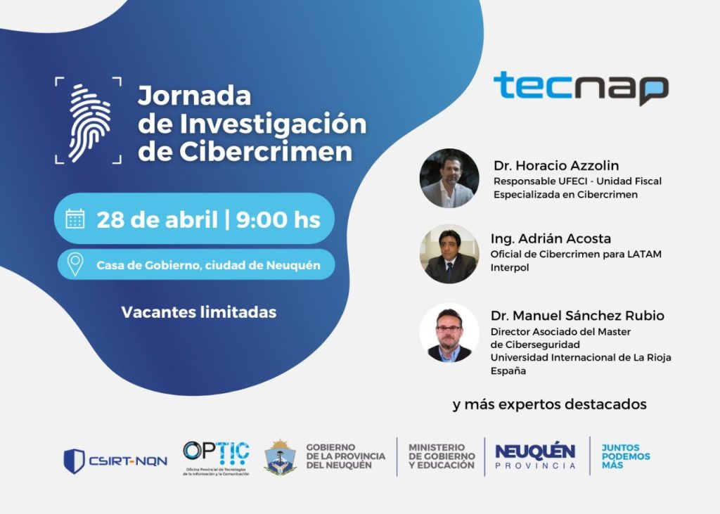 GACETILLA DE PRENSA: JORNADAS DE ACTUALIZACIÓN SOBRE INVESTIGACIÓN DEL CIBERCRIMEN25 de abril de 2022Los delitos cometidos en entornos virtuales afectan a ciudadanos, gobiernos, instituciones y empresas. La actividad contará con destacados expositores, es gratuita con inscripción previa y vacantes limitadas. Este jueves 28 de abril Neuquén será sede de las Jornadas de Investigación sobre Cibercrimen TECNAP, organizadas por OPTIC Neuquén, organismo dependiente del Ministerio de Gobierno y Educación. El encuentro busca dar a conocer novedades y promover herramientas jurídicas a disposición para hacer frente al incremento de los ciberdelitos. El cibercrimen es un fenómeno creciente que, aprovechando las características particulares de los entornos virtuales permite la comisión de delitos como el secuestro de identidad en cuentas de whatsapp y redes sociales, robos de información, estafas a través de homebanking, entre otros. El ministro de Gobierno y Educación, Osvaldo Llancafilo destacó: “Hoy nadie está exento de ser víctima de este tipo de delitos, estamos mucho tiempo conectados a herramientas tecnológicas tanto para el trabajo como en la vida cotidiana, y la pandemia lo incrementó”. “En nuestra provincia, el trabajo de la OPTIC en este sentido es fundamental, por un lado preservando la seguridad de los datos que permiten que las redes de trabajo y comunicación estén disponibles y por otro, la educación y concientización sobre ciberseguridad y los riesgos a los que nos exponemos cada día” expresó Llancafilo. La jornada contará con expositores destacados: Horacio Azzolin, Fiscal a cargo de la Unidad Fiscal Especializada en Investigación del Cibercrimen (UFECI) de la Procuraduría General de la Nación; Adrián Acosta de la División de Cibercrimen de la Policía Federal Argentina y Oficial de Interpol para América Latina; Miguel Sanchez Rubio, académico de la Universidad Internacional de La Rioja y Damian Obreque, Subcomisario de la Policía de Neuquén. Además, se expondrá sobre la estrategia de ciberseguridad del gobierno provincial para trabajar en la prevención del cibercrimen. El evento está dirigido a la comunidad judicial -jueces, fiscales, abogados, fuerzas policiales- y a toda la comunidad en general, interesada en la temática. La actividad comenzará a las 9.00 hs y se realizará en el Auditorio de Casa de Gobierno. La entrada es gratuita con cupos limitados, la inscripción es online ingresando en el siguiente enlace: www.eventbrite.com.ar/e/295188124627. El programa de la jornada puede consultarse aquí: csirt-nqn.neuquen.gov.ar/jornada-de-investigacion-de-cibercrimen/.