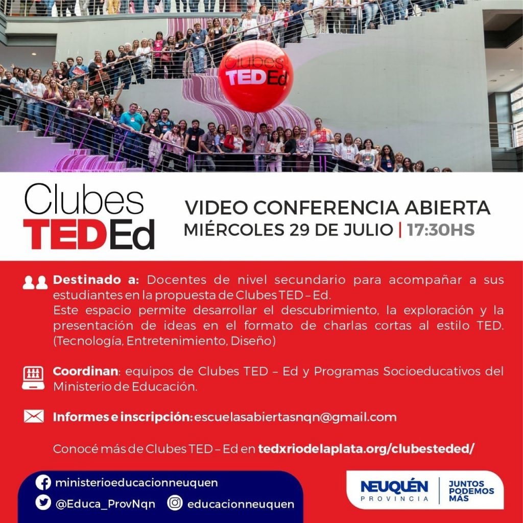 INVITAN A DOCENTES DE NIVEL SECUNDARIO A CHARLA SOBRE CLUBES TED-Ed27 de julio de 2020 El programa apoya a escuelas y organizaciones educativas que buscan embarcarse en la aventura de acompañar a sus estudiantes en el descubrimiento, la exploración y la presentación de ideas en forma de charlas cortas al estilo TED. El ministerio de Educación de la provincia del Neuquén invita a una videoconferencia destinada a docentes de nivel secundario que deseen acompañar a sus estudiantes en la propuesta de Clubes TED – Ed, un espacio donde podrán desarrollar el descubrimiento, la exploración y la presentación de ideas en el formato de charlas cortas al estilo TED. La jornada se llevará a cabo este miércoles 29 de Julio, a las 17:30hs, y estará coordinado por referentes de Clubes TED – Ed y el equipo de Programas Socioeducativos del Ministerio de Educación. La ministra de Educación y presidenta del CPE, Cristina Storioni, destacó que “esta invitación es una gran oportunidad donde, a través de diferentes encuentros de acompañamiento con las y los docentes, y partiendo de sus propios intereses, las y los estudiantes, investigando, cuestionando, reflexionando, estructurando y comunicando una idea que les apasiona, se convierten en protagonistas”. Informes e inscripción: escuelasabiertasnqn@gmail.com Sobre el programa Clubes TED-Ed El programa Clubes TED-Ed apoya a escuelas y organizaciones educativas que buscan embarcarse en la aventura de acompañar a sus estudiantes en el descubrimiento, la exploración y la presentación de ideas en forma de charlas cortas al estilo TED.En Clubes TED-Ed sostienen que las ideas pueden ayudar a transformar la educación, y al mismo tiempo, que una idea puede transformar a quien la cuenta. A lo largo de una serie de encuentros los estudiantes desarrollan una idea propia y aprenden a comunicarla. El equipo de Clubes TED-Ed trabaja con las y los docentes de la escuela, acompañándolos en la planificación e implementación de los encuentros y la organización de una instancia final en la que las y los estudiantes comparten sus ideas en una charla corta al estilo de TED, que se filma en video.