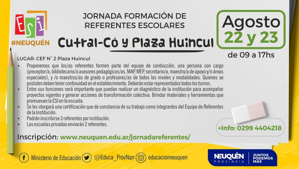 La formación de referentes en Educación Sexual Integral llega a Cutral Có y Plaza Huincul6 de agosto de 2019Se convoca a escuelas de las localidades a participar a través de sus referentes, quienes tendrán la función de generar acciones, brindar materiales y herramientas que promuevan la ESI en sus instituciones.El jueves 22 y el viernes 23 de agosto se realizarán en el CEF N°2, sito en Gregorio Álvarez y Av. Rotter, de Plaza Huincul, de 9 a 17hs, las Jornadas de Formación en Educación Sexual Integral (ESI).El objetivo de los encuentros es capacitar a referentes institucionales que impulsen la ESI en sus establecimientos, en el marco de la Resolución N° 340 del Consejo Federal de Educación que establece las acciones necesarias para el cumplimiento de la ley N° 26150 con enfoque en la Educación Sexual Integral, ya sea de manera transversal y a través de espacios curriculares específicos, así como en las normas que regulan la organización institucional.Promueve, además, que en todas las escuelas del país se organice un equipo docente referente de ESI que lleve adelante un enfoque interdisciplinario, funcione como nexo con el equipo provincial y actúe de enlace con el proyecto institucional de cada establecimiento.Para la actividad pueden inscribirse tres personas por institución educativa (dos personas en el caso de escuelas de educación privada). Como requisito de las personas que se postulen para integrar el equipo de referentes, una debe ser parte del equipo de conducción de la escuela, otra persona debe tener cargo (preceptor/a; bibliotecario/a; asesores/as pedagógicos, preceptores/as, map/mep; secretario/a; maestro de apoyo) y otra persona debe cumplir tareas frente a estudiantes (maestra/o de grado, profesor/a).De ser posible, deben estar todos los turnos representados en esas personas y las mismas deberán tener continuidad dentro del establecimiento. Se les otorgará una certificación que deje constancia de su trabajo como equipo referente de la institución.“La ESI es un derecho y debemos garantizar que llegue a todos los niños, niñas, adolescentes y jóvenes. Desde estos espacios trabajamos fortaleciendo a los equipos de trabajo para su implementación en las instituciones educativas”, destacó la ministra de Educación, Cristina Storioni.Por su parte, la Directora Provincial de Contenidos Trasversales, Gabriela Tagliavini explicó que, “ya realizamos estas formaciones en el norte de la provincia, en Centenario, en Plottier y en Neuquén capital. El objetivo es llegar a todo el territorio».La inscripción de los referentes la realizará el equipo directivo de cada institución educativa a través del formulario que se encuentra disponible en https://www.neuquen.edu.ar/jornadareferentes/