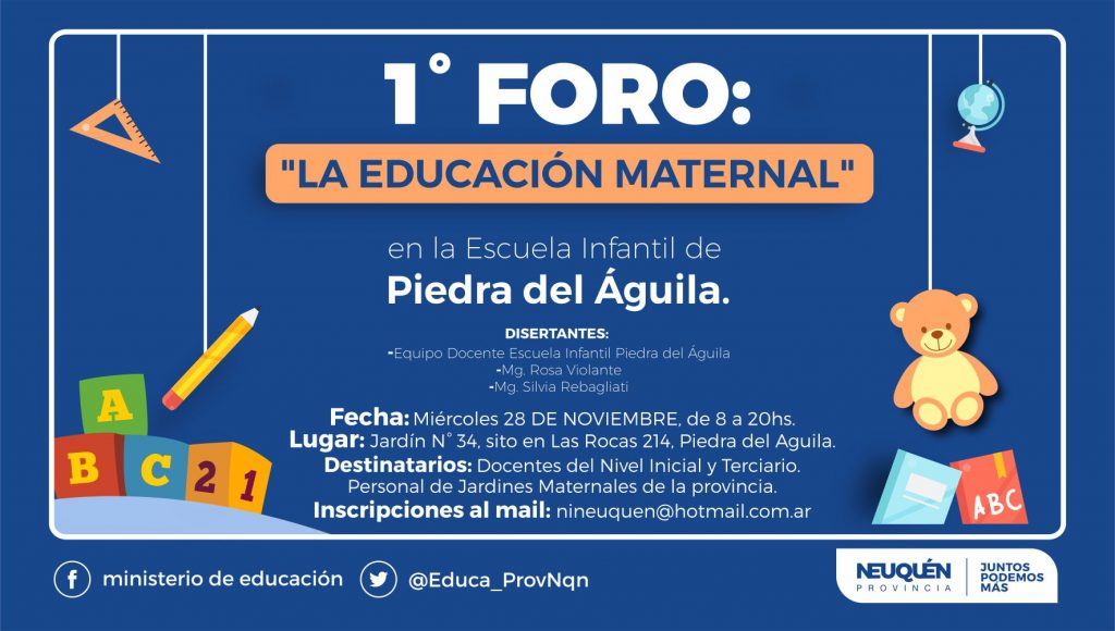 El 28 de noviembre se llevará a cabo un foro provincial sobre Educación Maternal en la Escuela Infantil de Piedra del Águila, para conocer y dialogar sobre la experiencia realizada este año en la primera escuela infantil de la provincia del Neuquén, según se informó desde el Consejo Provincial de Educación (CPE).