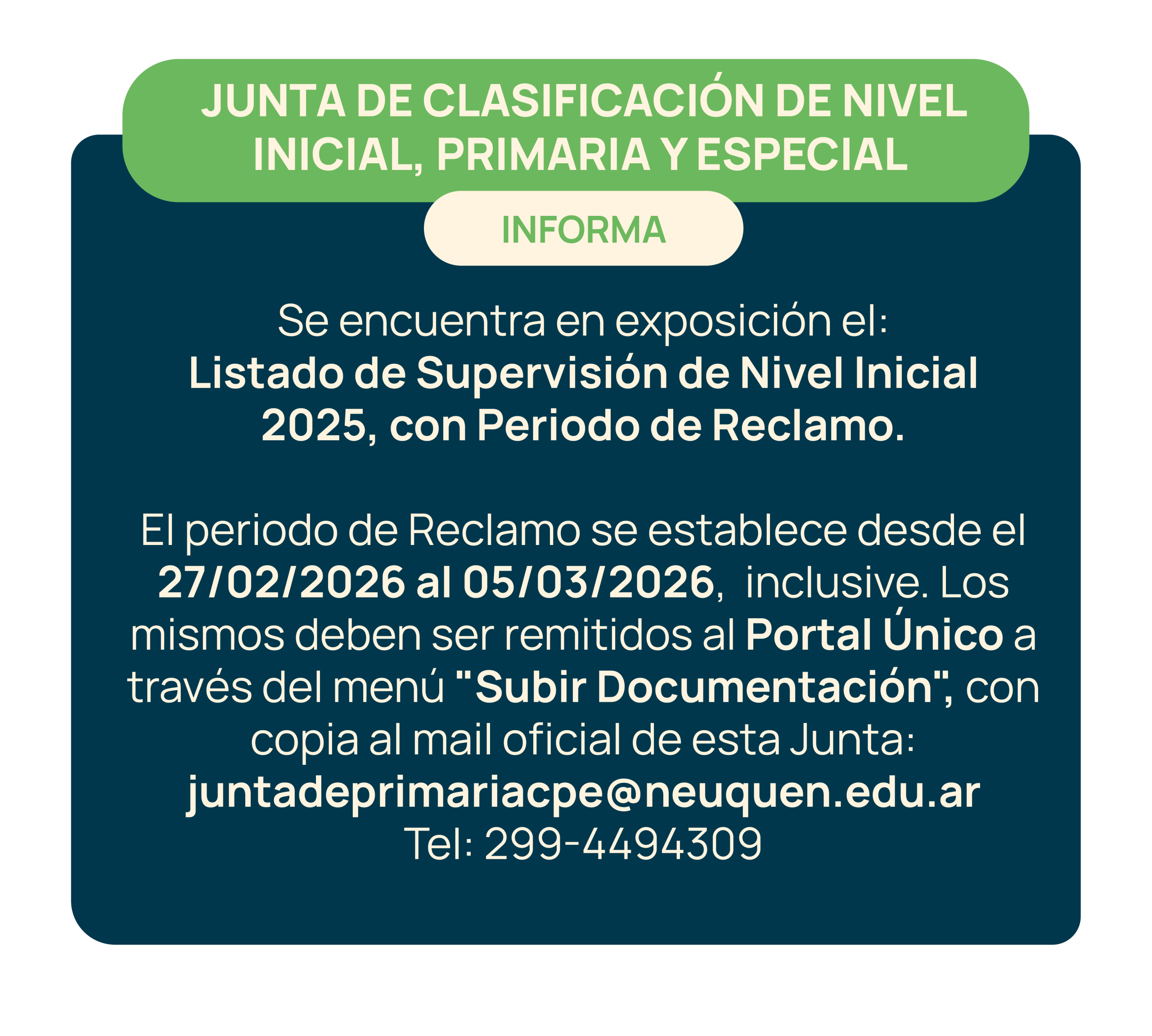 Junta de Clasificación Nivel Inicial, Primario y EspecialIntegrantes:PresidentaProf. Patricia Alejandra Moya SecretariaProf. Telma RozarVocal · Representante del EjecutivoMariángeles M. GómezVocal · Representante de los y las docentesProf. Tatiana BorquezVocal · Representante de los y las docentesProf. Cristian Lermanda.Contacto:Teléfono: 4494309Mail: juntadeprimariacpe@neuquen.edu.arINFORMACIÓNRs._1110_2023Dictamen de AntecedentesCursos y-o postitulosLISTADO DE CABECERAS COMPLETO 2026 –Nota Múltiple de Clasificación Anual 2024 – Modelo-Clasificación-Anual 2024Requisitos para inscribirse en la provincia Sobre Autenticación /Dictamen 76-19ACTA N° 86-2024- IF-2024-02115246-NEU-JUNTACLAS%CPENOTA 1594-24 AVAL CURSOS 2025FORMULARIOS Y PLANILLASFormulario-Solictud-de-prorrogaAutorizacion-para-toma-de-cargo 2025Planilla Interinatos y Suplencias y Llamado a 48 hsPlanilla Inscripción Rs. N°1623-964-776-1171-637MOVIMIENTO – Planilla inscripción (1)INGRESO – Planilla inscripción (1)CONVOCATORIAS/LISTADOS – AÑOS ANTERIORESIngreso a la DocenciaMovimiento de PersonalInterinatos y SuplenciasComplementariasSupervisiónLlamados a 48 hs. 2024Listados EAPTSE (Click Aquí) Listados de interinatos y/o suplencias 2026 /Click Aquí)Complementarias (Click Aquí)Supervisión (Click Aquí)Llamados a 48 hs (Click Aquí)Ingreso a la Docencia – Rs. y Vacantes (Click Aquí)Movimiento de Personal Rs. y Vacantes (Click Aquí)Rectificaciones listados (Click Aquí)Documentación (Click Aquí)Notas/ Múltiples/Dictamen (Click Aquí)MODIFICACIONES EN LISTADOS DE INTERINATOS Y SUPLENCIAS JERÁRQUICOSRs. 637/19 CLASIFICACIÓN SUPERVISIÓN .Rs. 1623/01 INTERINATOS Y/O SUPLENCIAS CARGOS JERÁRQUICOS .Rs. 776/03 CARGOS JERÁRQUICOS ESCUELAS ALBERGUES.NOVEDADES 2026 LISTADO : CLASIF.ANUAL 2026 SUPERVISION NIVEL INICIAL (DIR. 1°) Neuquén, viernes 27 de febrero de 2026.-Neuquén, miércoles 11 de febrero de 2026.- COMUNICADO DE PRENSA Neuquén, martes 10 de febrero de 2026.- COMUNICADO DE PRENSA LINK: https://cloud.neuquen.gov.ar/s/qPsMWZQJwkX3m4q Neuquén, lunes 02 de febrero de 2026.- COMUNICADO DE PRENSALa Junta de Clasificación Inicial, Primaria y Modalidad Especial informa que se encuentra a disposición el cronograma de Asambleas de Ingreso a la Docencia y Movimiento de Personal 2026.Cronograma Movimiento de PersonalCronograma Ingreso a la Docencia COMUNICADO DE PRENSALos mismos se pueden visualizar en el siguiente enlace: https://cloud.neuquen.gov.ar/s/qPsMWZQJwkX3m4q Neuquén, lunes 19 de enero de 2026.-COMUNICADO DE PRENSALos mismos pueden ser consultados aquí:Interinatos y/o suplencias https://cloud.neuquen.gov.ar/s/WS4lZn0wiAKfGpe Neuquén, lunes 12 de enero de 2026.-COMUNICADO DE PRENSALa Junta de Clasificación Nivel Inicial, Primario y modalidad Especial informa que se encuentra abierta la INSCRIPCION A ASCENSO DE JERARQUIA 2025 «CONCURSO DE TITULOS ANTECEDENTES Y OPOSICIÓN, desde el 17 de diciembre de 2025 al 12 de enero de 2026 inclusive.La misma se realiza a través del Portal Único https://portalunico.neuquen.edu.ar/RESOLUCION CONCURSO DE JERARQUIA 2025 NIVEL INICIALRESOLUCION CONCURSO DE JERARQUIA 2025 NIVEL PRIMARIORESOLUCION CONCURSO DE JERARQUIA 2025 MODALIDAD ESPECIALEnlace del cloud para poder visualizar las resoluciones del concurso de jerarquía 2025: https://cloud.neuquen.gov.ar/s/rKqM6ERlsTBkgyhCada inscripto/a deberá subir al PU el certificado de Antecedente Penal Nacional actualizado, según Rs.1501/22 NOTA MULTIPLENeuquén, miércoles 17 de diciembre de 2025.-COMUNICADO DE PRENSALa Junta de Clasificación Nivel Inicial, Primario y Modalidad Especial informa a los/las interesados/as que se encuentra abierta la Inscripción para Ingreso a la docencia y Movimiento de Personal 2025 desde el 10/11/2024 hasta el 09/12/2025 inclusive.Resoluciones de convocatoria a inscripción a INGRESO a la Docencia 2025 (se irán subiendo a medida que se estén protocolizadas).Neuquén, 10 de diciembre de 2025Ingreso a la Docencia https://cloud.neuquen.gov.ar/s/ooNVCXsT5Ts7DTGMovimiento de Personal https://cloud.neuquen.gov.ar/s/ud7oTy70sXnKnEeMUY IMPORTANTE: Subir en documentación los Antecedentes Penales según Rs 1501/22Recordamos que la Inscripción a las Convocatorias de Ingreso o Movimiento NO OTORGAN PUNTAJE. COMUNICADO DE PRENSALa Junta de Clasificación de Nivel Inicial, Primario y Modalidad Especial informa que se encuentran publicados los listados con periodo de Reclamo AGOTADO, para cubrir los cargos de EAPTSE (Equipos de Apoyo a las Trayectorias Socio Educativas).EAPTSE– Listados con periodo de reclamo Agotado Click Aquí COMUNICADO DE PRENSA La Junta de Clasificación Nivel Inicial, Primario y Modalidad Especial informa a los/las interesados/as que se encuentran en exposición los listados de Interinatos y/o Suplencias 2026 con Período de Reclamo desde el 03/11/2025 hasta el 07/11/2025 inclusive Los mismos pueden ser consultados aquí: Interinatos y/o Suplencias (Click Aquí)Los reclamos se recepcionarán por el Portal Único seleccionando en el Menú: “MIS RECLAMOS”, detallándolo de manera específica.Los que se llevaron a cabo al 30/06/2025.Los que se subieron al Portal dentro del período de Inscripción al 20/07/2025, según prórroga. Rs 637/19 INTERINATOS Y/O SUPLENCIAS CLASIFICACIÓN SUPERVISIÓN CON PERÍODO DE RECLAMO 2026.Rs 1623/01 INTERINATOS Y/O SUPLENCIAS CARGOS JERÁRQUICOS CON PERÍODO DE RECLAMO 2026.Rs 777/25 INTERINATOS Y/O SUPLENCIAS CARGOS JERÁRQUICOS CON PERÍODO DE RECLAMO 2026.Rs 776/03 INTERINATOS Y/O SUPLENCIAS CARGOS JERÁRQUICOS ESCUELAS ALBERGUES CON PERÍODO DE RECLAMO 2026.Rs 964/06 INTERINATOS Y/O SUPLENCIAS SECRETARIAS ESCUELAS CABECERAS CON PERÍODO DE RECLAMO 2026INTERINATOS Y/O SUPLENCIAS CON PERÍODO DE RECLAMO 2026 (TODAS LAS ESCUELAS CABECERAS) Neuquén, lunes 03 de noviembre de 2025.-La Junta de Clasificación de Nivel Inicial, Primario y Modalidad Especial informa que se encuentran publicados los listados correspondiente