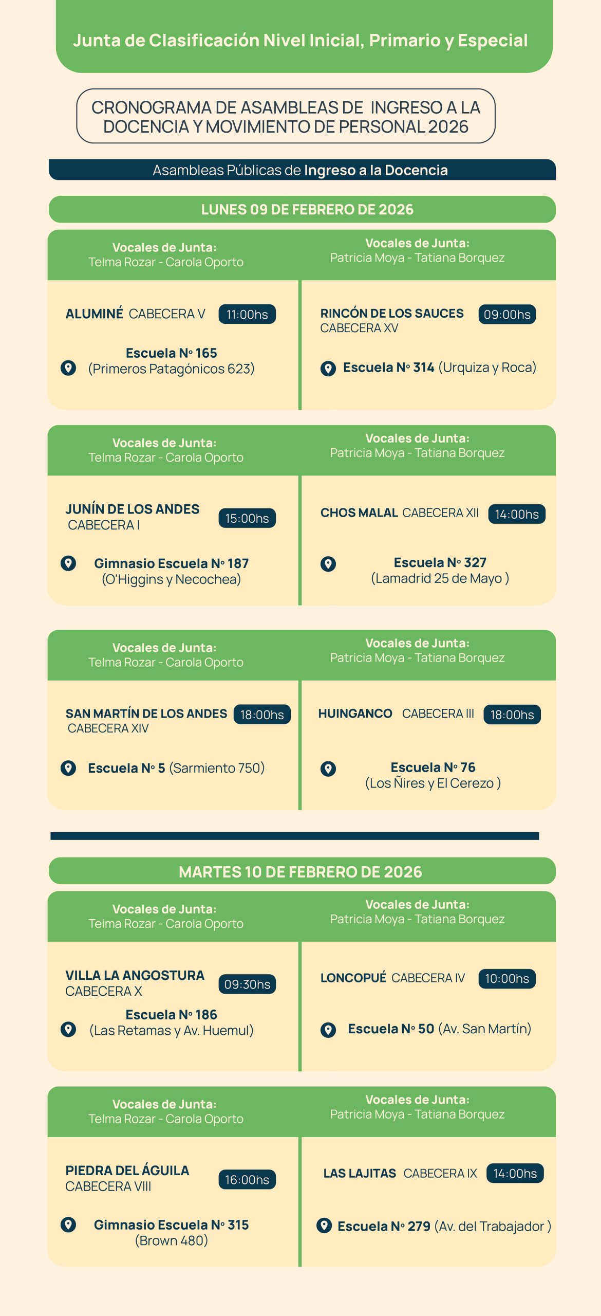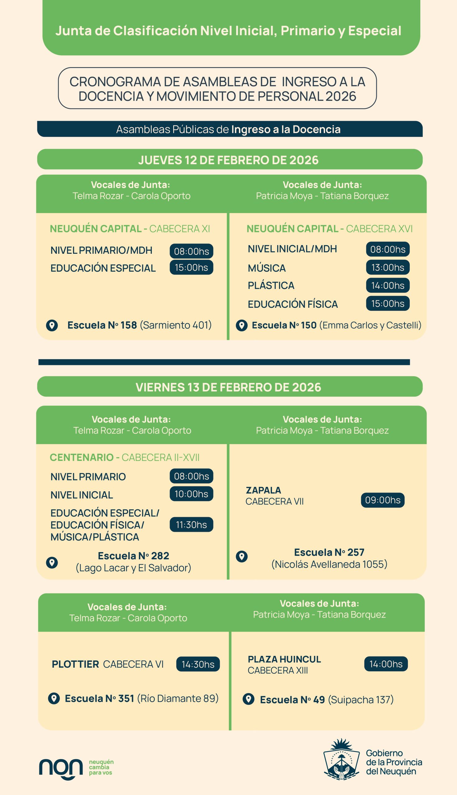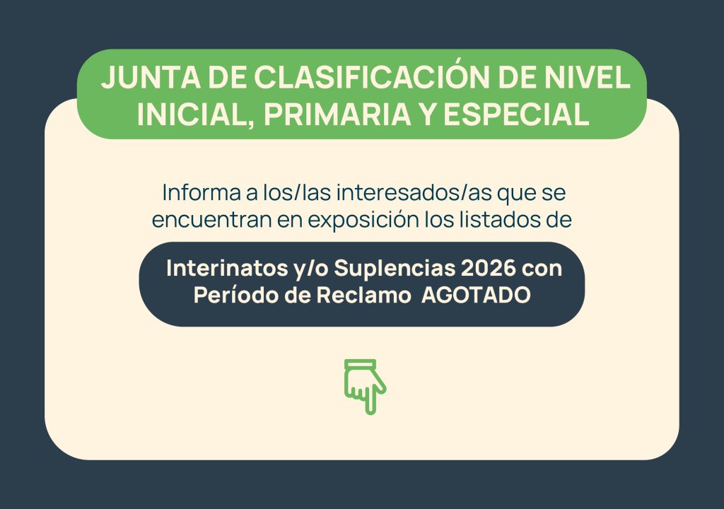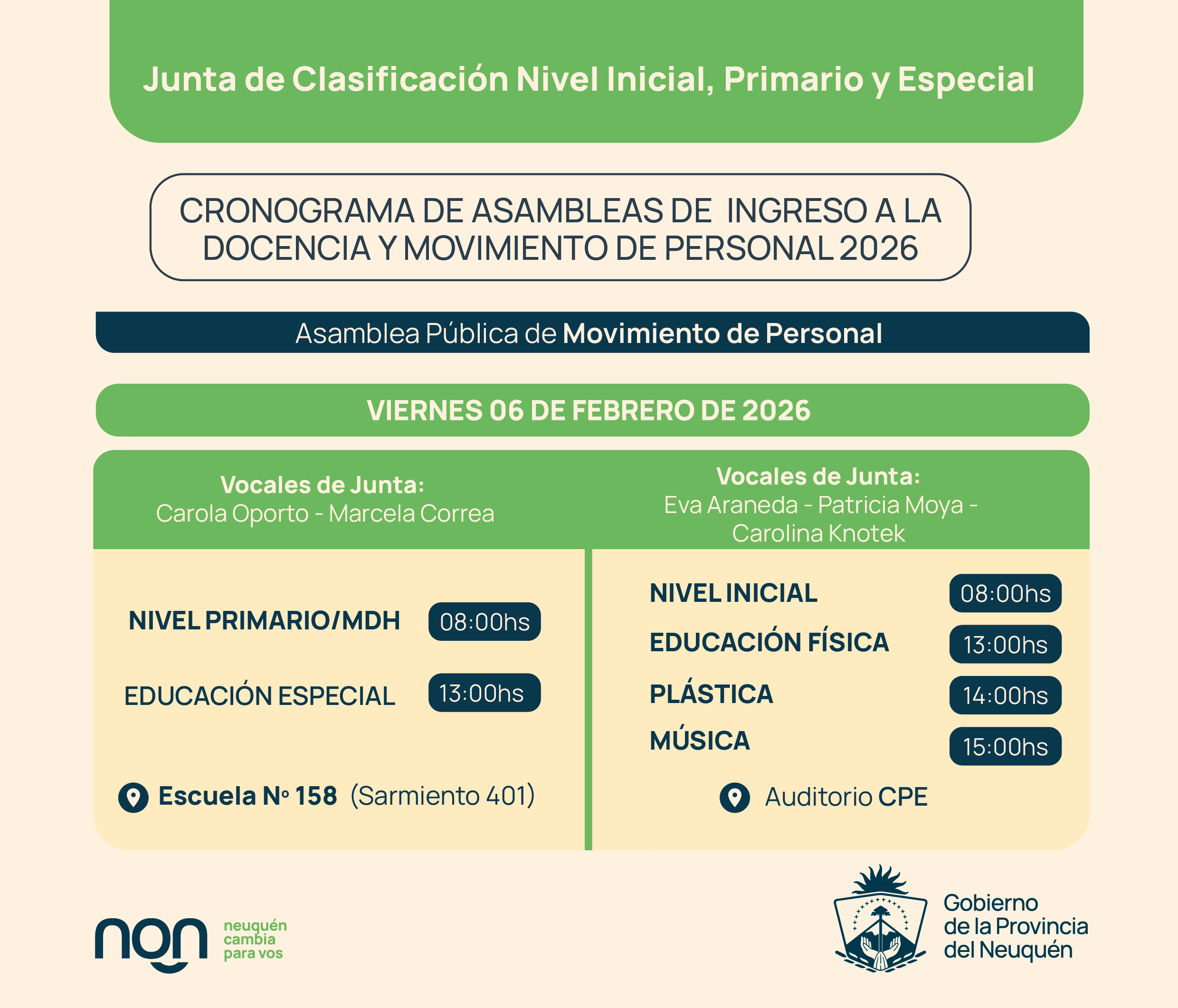 Junta de Clasificación Nivel Inicial, Primario y EspecialIntegrantes:Presidenta Prof. Eva B. AranedaSecretariaProf. Patricia Alejandra Moya Vocal · Representante del EjecutivoProf. Carola M. OportoVocal · Representante de los y las docentesProf. Marcela Edith CorreaVocal · Representante de los y las docentesProf. Carolina A. Knotek.Contacto:Teléfono: 4494309Mail: juntadeprimariacpe@neuquen.edu.arINFORMACIÓNRs._1110_2023Dictamen de AntecedentesCursos y-o postitulosESCUELAS CABECERAS- 2025Nota Múltiple de Clasificación Anual 2024 – Modelo-Clasificación-Anual 2024Requisitos para inscribirse en la provincia Sobre Autenticación /Dictamen 76-19ACTA N° 86-2024- IF-2024-02115246-NEU-JUNTACLAS%CPENOTA 1594-24 AVAL CURSOS 2025FORMULARIOS Y PLANILLASFormulario Solictud de prórroga- AÑO 2025Autorizacion-para-toma-de-cargo 2025Planilla Interinatos y Suplencias y Llamado a 48 hsPlanilla Inscripción Rs. N°1623-964-776-1171-637MOVIMIENTO – Planilla inscripción (1)INGRESO – Planilla inscripción (1)CONVOCATORIAS/LISTADOS – AÑOS ANTERIORESIngreso a la DocenciaMovimiento de PersonalInterinatos y SuplenciasComplementariasSupervisiónLlamados a 48 hs. 2024Listados EAPTSE (Click Aquí) Listados de interinatos y/o suplencias 2026 /Click Aquí)Complementarias (Click Aquí)Supervisión (Click Aquí)Llamados a 48 hs (Click Aquí)Ingreso a la Docencia – Rs. y Vacantes (Click Aquí)Movimiento de Personal Rs. y Vacantes (Click Aquí)Rectificaciones listados (Click Aquí)Documentación (Click Aquí)Notas/ Múltiples/Dictamen (Click Aquí)MODIFICACIONES EN LISTADOS DE INTERINATOS Y SUPLENCIAS JERÁRQUICOSRs. 637/19 CLASIFICACIÓN SUPERVISIÓN .Rs. 1623/01 INTERINATOS Y/O SUPLENCIAS CARGOS JERÁRQUICOS .Rs. 776/03 CARGOS JERÁRQUICOS ESCUELAS ALBERGUES.NOVEDADES 2026COMUNICADO DE PRENSALa Junta de Clasificación Inicial, Primaria y Modalidad Especial informa que se encuentra a disposición el cronograma de Asambleas de Ingreso a la Docencia y Movimiento de Personal 2026.Cronograma Movimiento de PersonalCronograma Ingreso a la Docencia COMUNICADO DE PRENSALos mismos se pueden visualizar en el siguiente enlace: https://cloud.neuquen.gov.ar/s/qPsMWZQJwkX3m4q Neuquén, lunes 19 de enero de 2026.-COMUNICADO DE PRENSALos mismos pueden ser consultados aquí:Interinatos y/o suplencias https://cloud.neuquen.gov.ar/s/WS4lZn0wiAKfGpe Neuquén, lunes 12 de enero de 2026.-COMUNICADO DE PRENSALa Junta de Clasificación Nivel Inicial, Primario y modalidad Especial informa que se encuentra abierta la INSCRIPCION A ASCENSO DE JERARQUIA 2025 «CONCURSO DE TITULOS ANTECEDENTES Y OPOSICIÓN, desde el 17 de diciembre de 2025 al 12 de enero de 2026 inclusive.La misma se realiza a través del Portal Único https://portalunico.neuquen.edu.ar/RESOLUCION CONCURSO DE JERARQUIA 2025 NIVEL INICIALRESOLUCION CONCURSO DE JERARQUIA 2025 NIVEL PRIMARIORESOLUCION CONCURSO DE JERARQUIA 2025 MODALIDAD ESPECIALEnlace del cloud para poder visualizar las resoluciones del concurso de jerarquía 2025: https://cloud.neuquen.gov.ar/s/rKqM6ERlsTBkgyhCada inscripto/a deberá subir al PU el certificado de Antecedente Penal Nacional actualizado, según Rs.1501/22 NOTA MULTIPLENeuquén, miércoles 17 de diciembre de 2025.-COMUNICADO DE PRENSALa Junta de Clasificación Nivel Inicial, Primario y Modalidad Especial informa a los/las interesados/as que se encuentra abierta la Inscripción para Ingreso a la docencia y Movimiento de Personal 2025 desde el 10/11/2024 hasta el 09/12/2025 inclusive.Resoluciones de convocatoria a inscripción a INGRESO a la Docencia 2025 (se irán subiendo a medida que se estén protocolizadas).Neuquén, 10 de diciembre de 2025Ingreso a la Docencia https://cloud.neuquen.gov.ar/s/ooNVCXsT5Ts7DTGMovimiento de Personal https://cloud.neuquen.gov.ar/s/ud7oTy70sXnKnEeMUY IMPORTANTE: Subir en documentación los Antecedentes Penales según Rs 1501/22Recordamos que la Inscripción a las Convocatorias de Ingreso o Movimiento NO OTORGAN PUNTAJE. COMUNICADO DE PRENSALa Junta de Clasificación de Nivel Inicial, Primario y Modalidad Especial informa que se encuentran publicados los listados con periodo de Reclamo AGOTADO, para cubrir los cargos de EAPTSE (Equipos de Apoyo a las Trayectorias Socio Educativas).EAPTSE– Listados con periodo de reclamo Agotado Click Aquí COMUNICADO DE PRENSA La Junta de Clasificación Nivel Inicial, Primario y Modalidad Especial informa a los/las interesados/as que se encuentran en exposición los listados de Interinatos y/o Suplencias 2026 con Período de Reclamo desde el 03/11/2025 hasta el 07/11/2025 inclusive Los mismos pueden ser consultados aquí: Interinatos y/o Suplencias (Click Aquí)Los reclamos se recepcionarán por el Portal Único seleccionando en el Menú: “MIS RECLAMOS”, detallándolo de manera específica.Los que se llevaron a cabo al 30/06/2025.Los que se subieron al Portal dentro del período de Inscripción al 20/07/2025, según prórroga. Rs 637/19 INTERINATOS Y/O SUPLENCIAS CLASIFICACIÓN SUPERVISIÓN CON PERÍODO DE RECLAMO 2026.Rs 1623/01 INTERINATOS Y/O SUPLENCIAS CARGOS JERÁRQUICOS CON PERÍODO DE RECLAMO 2026.Rs 777/25 INTERINATOS Y/O SUPLENCIAS CARGOS JERÁRQUICOS CON PERÍODO DE RECLAMO 2026.Rs 776/03 INTERINATOS Y/O SUPLENCIAS CARGOS JERÁRQUICOS ESCUELAS ALBERGUES CON PERÍODO DE RECLAMO 2026.Rs 964/06 INTERINATOS Y/O SUPLENCIAS SECRETARIAS ESCUELAS CABECERAS CON PERÍODO DE RECLAMO 2026INTERINATOS Y/O SUPLENCIAS CON PERÍODO DE RECLAMO 2026 (TODAS LAS ESCUELAS CABECERAS) Neuquén, lunes 03 de noviembre de 2025.-La Junta de Clasificación de Nivel Inicial, Primario y Modalidad Especial informa que se encuentran publicados los listados correspondientes al Llamado a 48 hs realizado los días 22 y 23 de septiembre, para cubrir los cargos EAPTSE (Equipos de Apoyo a las Trayectorias Socio Educativas), con periodo de reclamo desde el día 27 al 31 de octubre a través del portal único. La Junta de Clasificación de Nivel Inicial, Primario y Modalidad Especial informa q