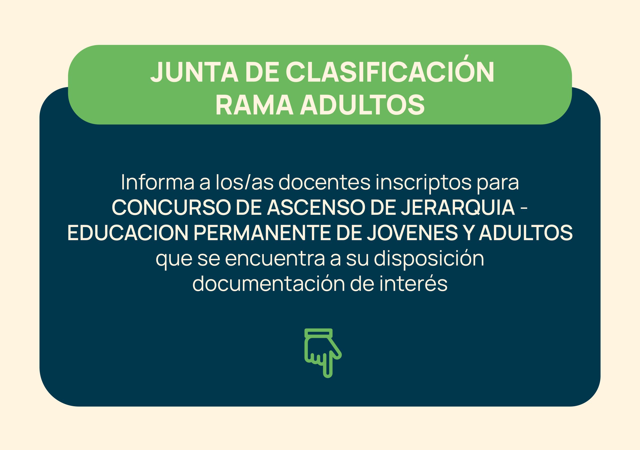 Junta de Clasificación Rama AdultosIntegrantesProf. Haydeé Dayci IslaPresidente Héctor Javier Ceferino MazzantiSecretarioAlejandra Daniela AlonsoVocal · Poder EjecutivoProf. Marcia Esther LunaVocal Electa ContactoTeléfono: 4494320Mail: jcra@neuquen.edu.arNovedades 2026 Documentación de Interés:r_1653_2025 (1) IF-2025-03015148-NEU-JOVADUL_CPE IF-2025-03367380-NEU-DESP_CPE Neuquén, 30 de enero de 2026 La Junta de Clasificación – Rama Adultos informa:A los/as interesados/as que se encuentran publicados los listados provisorios 2026 de Ingreso con periodo de Reclamo (Res. N.º 1634/25 ) y de Movimiento (Res. N.º 1635/25) para el cargo de Maestro/a de Ciclo – Educación Básica EPJA.Período de reclamo desde el 23/01/2026 hasta el 29/01/2026 inclusive. Los mismos se realizan a través del Portal ÚnicoLos mismos pueden ser consultados en la página web del C.P.E.: https://www.neuquen.edu.ar/rama-adultos/, ►Listado PROVISORIOS MOVIMIENTO DE PERSONAL 2026: https://cloud.neuquen.gov.ar/s/pZFP4Vy7QQWHhzB ►Listados PROVISORIOS por cabecera INGRESO 2026: * EPA N° 9 – Neuquén: https://cloud.neuquen.gov.ar/s/Sk8WSqM6ZXNQi35* CFP N° 30 – Zapala: https://cloud.neuquen.gov.ar/s/F6p7vjM2n6C8qdS* CFP N° 20 – Chos Malal: https://cloud.neuquen.gov.ar/s/VH91IkS0M07UocM* CFP N° 19 – San Martín de los Andes: https://cloud.neuquen.gov.ar/s/44PHaRVQ3UtOzVr* CFP N° 16 – Andacollo: https://cloud.neuquen.gov.ar/s/1v2DqLHJQ3mqQ3h* EPA N° 14 – Plottier: https://cloud.neuquen.gov.ar/s/jOfGVlS89XRfvX0* EPA N° 5 – Cutral Có: https://cloud.neuquen.gov.ar/s/3Mlr0QgbyaYvAeG* EPA N° 8 – Centenario: https://cloud.neuquen.gov.ar/s/c6OkD2E0lFwvdbE* CFP N°38 – Villa Pehuenia: https://cloud.neuquen.gov.ar/s/ZsFMHb9PfnDNAXY* CFP N°24 – Villa la Angostura: https://cloud.neuquen.gov.ar/s/S4XqrRBlWULWiVA* NUCLEAMIENTO Nº 6 – Piedra del Águila: https://cloud.neuquen.gov.ar/s/VuL8wrFxhqgz664Neuquén, 23 de enero de 2026La Junta de Clasificación – Rama Adultos informa:A los/as interesados/as que se encuentran publicados los listados provisorios 2026 de Ingreso con periodo de Reclamo (Res. N.º 006/26 ) y de Movimiento (Res. N.º 007/26) para el cargo de Maestro/a de Ciclo – Educación Básica ECPL.Período de reclamo desde el 23/01/2026 hasta el 29/01/2026 inclusive. Los mismos se realizan a través del Portal Único ►Listado PROVISORIOS MOVIMIENTO DE PERSONAL 2026: https://cloud.neuquen.gov.ar/s/ETln1IVHEwPXYf7 ►Listados PROVISORIOS por cabecera INGRESO 2026: * CFP N° 30 – Zapala: https://cloud.neuquen.gov.ar/s/sAkWfOGkh5dJy2X* CFP N° 20 – Chos Malal: https://cloud.neuquen.gov.ar/s/zj5ttLpdrZ3E9tb* CFP N° 19 – San Martín de los Andes: https://cloud.neuquen.gov.ar/s/34xjRPiyiWdCp6v* EPA N° 9 –Neuquén: https://cloud.neuquen.gov.ar/s/sbURVA5ktctkOne* EPA N° 14 – Plottier: https://cloud.neuquen.gov.ar/s/6EsbeH4diO9vM5M * EPA N° 5 – Cutral Có https://cloud.neuquen.gov.ar/s/B3NZvFIwWsfsVlJ Neuquén, 23 de enero de 2026 La Junta de Clasificación Rama Adultos Informa:CFP Nº 8 – LONCOPUE: https://cloud.neuquen.gov.ar/s/bcSroLMmn956lGsCFP Nº 16 – ANDACOLLO: https://cloud.neuquen.gov.ar/s/iwoe2LdCMG39TZ0CFP Nº 19 – SAN MARTIN DE LOS ANDES: https://cloud.neuquen.gov.ar/s/nKNZ5ib9FkhTv8hCFP Nº 20 – CHOS MALAL: https://cloud.neuquen.gov.ar/s/g504RVieeL0iqtmCFP Nº 24 – VILLA LA ANGOSTURA: https://cloud.neuquen.gov.ar/s/SamqUFS7Y59yI1FCFP Nº 30 – ZAPALA: https://cloud.neuquen.gov.ar/s/dHfgwSdNdgKQu16CFP Nº 38 – VILLA PEHUENIA: https://cloud.neuquen.gov.ar/s/j6e7A7cNGKYSZS9EPA Nº 5 – CUTRAL CO: https://cloud.neuquen.gov.ar/s/b6me0rjyx507Or5EPA Nº 8 – CENTENARIO: https://cloud.neuquen.gov.ar/s/vAuVL2fLoiW88FSEPA Nº 9 – NEUQUEN: https://cloud.neuquen.gov.ar/s/2nK54WWfuPRvozOEPA Nº 14 – PLOTTIER: https://cloud.neuquen.gov.ar/s/WrZ9sZJFn6d0S0fNUCLEAMIENTO Nº 6 – PIEDRA DEL AGUILA: https://cloud.neuquen.gov.ar/s/2XXnqwNCvgOSYMGNovedades 2025 La Junta de Clasificación Rama Adultos informa:A los/as interesados/as, que se encuentran en exposición los listados Provisorios de Interinatos y Suplencias 2026 con periodo de reclamo del 15/12 al 19/12/2025 inclusive. El reclamo debe realizarse a través del portal único: https://portalunico.neuquen.edu.ar/CFP Nº 8 – LONCOPUE: https://cloud.neuquen.gov.ar/s/YzAG5vLjpTiygYLCFP Nº 16 – ANDACOLLO: https://cloud.neuquen.gov.ar/s/6rPkYUNxdrXk0iwCFP Nº 19 – SAN MARTIN DE LOS ANDES: https://cloud.neuquen.gov.ar/s/xn6NFeftCAT7KUkCFP Nº 20 – CHOS MALAL: https://cloud.neuquen.gov.ar/s/vwraJwCMTTFMA0aCFP Nº 24 – VILLA LA ANGOSTURA: https://cloud.neuquen.gov.ar/s/aQpI7FHPINrMzmxCFP Nº 30 – ZAPALA: https://cloud.neuquen.gov.ar/s/LSiEN5GR8AVnYP7CFP Nº 38 – VILLA PEHUENIA: https://cloud.neuquen.gov.ar/s/ziXstc8IohaDdlJEPA Nº 5 – CUTRAL CO: https://cloud.neuquen.gov.ar/s/HEwDEYulozaztwwEPA Nº 8 – CENTENARIO: https://cloud.neuquen.gov.ar/s/MhGKNV8b92VTCgZEPA Nº 9 – NEUQUEN: https://cloud.neuquen.gov.ar/s/YywVIB9fQ0JFeyeEPA Nº 14 – PLOTTIER: https://cloud.neuquen.gov.ar/s/doJ2wWBw55tCnRCNUCLEAMIENTO Nº 6 – PIEDRA DEL AGUILA: https://cloud.neuquen.gov.ar/s/szxWa06rQdzJOHINeuquén, 15 de diciembre de 2025 La Junta de Clasificación Rama Adultos Informa:A los/as interesados/as se encuentra disponible en los siguientes links las Resoluciones para cubrir los cargos de Maestro de Ciclo DCB-7, en Escuelas para Adultos, Nucleamientos Educativos, Centro de Enseñanza para Adultos y Centros de Formación Profesional de la Provincia del Neuquén, de acuerdo con lo establecido en el Estatuto del Docente, Ley 14.473.Resolución N°1834/25 Ingreso a la Docencia: https://cloud.neuquen.gov.ar/s/C7MKVr5qYf8vdBGResolución N°1835/25 Movimiento de Personal: https://cloud.neuquen.gov.ar/s/1rTnc8WiiiubJHzNeuquén, 10 de diciembre de 2025 RESOLUCION N°1653/25: https://cloud.neuquen.gov.ar/s/uOYg0nyHFI03ABF Bibliografía:Res. 1653Marco Bibliográfico propuestoRes. 2004Res. 1999 IMPORTANTE: Según 