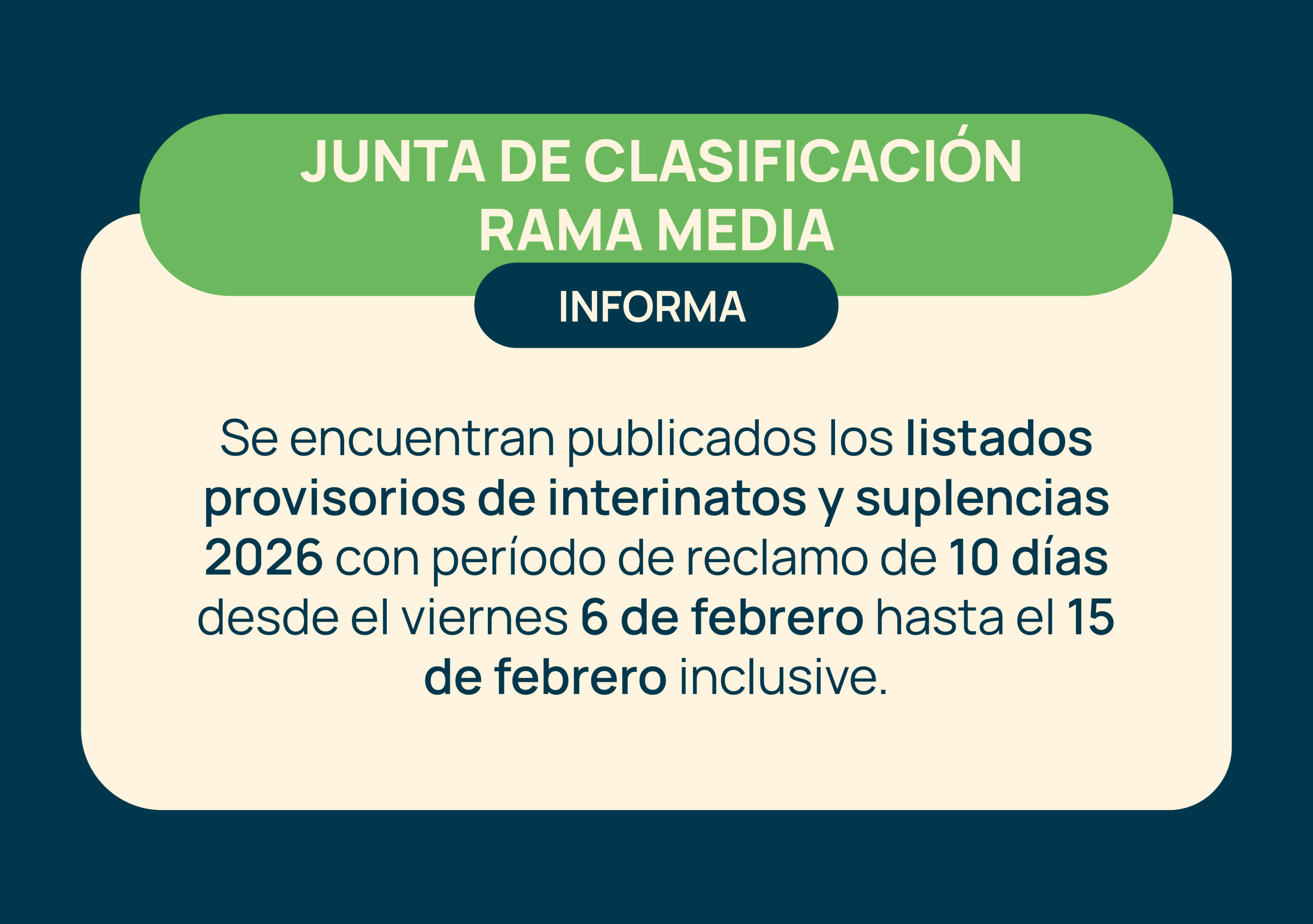 La Junta de Clasificación Rama Media y Técnica informa que se encuentra vigente a partir del día 06 de febrero el Listado Provisorio de Interinatos y Suplencias 2026.