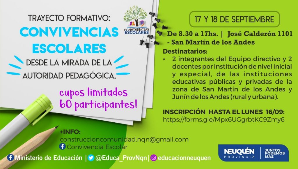 Se desarrollará en San Martín de los Andes el Trayecto Convivencias Escolares desde la mirada de la autoridad pedagógica12 de septiembre de 2019La misma apunta a propiciar la construcción conjunta de estrategias, para gestar convivencias más democráticas, en el marco de una escuela democrática y justa.El Ministerio de Educación informa que la capacitación “Convivencias Escolares desde la mirada de la autoridad pedagógica”, se desarrollará en la localidad de San Martín de los Andes, los días 17 y 18 de septiembre, de 8:30 a 17:30 en José Calderón N°1101 (Sede ATEN).Para la actividad, se convoca a dos integrantes del equipo directivo y dos docentes por institución de los niveles Inicial y Especial, que se desempeñen en instituciones educativas públicas y privadas de San Martín de los Andes y Junín de los Andes (rural y urbana).El presente trayecto formativo tiene como propósito visualizar los mayores obstáculos con los que se encuentran las instituciones a la hora de hablar de convivencias escolares. Se pretende realizar un recorrido que posibilite ir articulando debates que tomen como punto de partida las significaciones que los docentes han construido en torno a las convivencias escolares.Además, se profundizará sobre el concepto de las convivencias escolares para interrogar sobre qué efectos produce el rol del docente en la construcción de la autoridad pedagógica. Finalmente, se trabajará en la planificación de estrategias que operen como herramientas para llevar a cabo la tarea cotidiana.“Será un espacio enriquecedor para propiciar la construcción de estrategias en pos de favorecer las convivencias en los ámbitos escolares y en las formas de vincularse con la institución, sorteando las dificultades con las que nos encontramos cotidianamente en los establecimientos educativos”, sostuvo la ministra de Educación, Cristina Storioni.La capacitación es organizada desde el equipo de Convivencias Escolares de la dirección provincial de Contenidos Transversales del ministerio de Educación de la provincia.Las inscripciones pueden realizarse completando el formulario que se encuentra disponible en: https://forms.gle/Mpx6UGgrbtKC9Zmy6 hasta el 16 de septiembre. Los cupos son limitados.