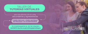 TALLER DE TUTORÍAS VIRTUALES PARA ESTUDIANTES DE ESCUELAS SECUNDARIAS6 de enero de 2022Está destinado a acompañar a trayectorias socioeducativas del Nivel Secundario y a egresados y egresadas que adeuden materias.—El Ministerio de Gobierno y Educación, en el marco del programa educativo “Acompañar: Puentes de Igualdad”, propone espacios de acompañamiento pedagógico a trayectorias del Nivel Secundario a través del “Taller de Tutorías Virtuales”. La iniciativa está destinada a estudiantes de escuelas secundarias y a egresados y egresadas que adeuden materias. Forma parte de una serie de propuestas socieducativas que se desarrollan dentro de un plan definido por el gobernador Omar Gutiérrez y coordinado por la cartera que conduce el ministro Osvaldo Llancafilo. El “Taller de Tutorías Virtuales” comienza el 10 de enero y cuenta con espacios pedagógicos en: Matemática, Lengua y Literatura, Contabilidad, Inglés, Geografía, Biología, Física, Química, Físico-Química, Química Orgánica, Matemática Financiera y, Análisis Matemático. La presidenta del Consejo Provincial de Educación, Ruth Flutsch, destacó que esta iniciativa “es parte de las diferentes acciones de la agenda de políticas educativas que buscan acompañar las trayectorias de las y los estudiantes garantizando más derecho, más aprendizaje, más igualdad educativa y más inclusión”. La iniciativa es coordinada de manera conjunta por la dirección provincial de Educación Secundaria; la dirección provincial de Educación Técnica, Formación Profesional y CERET dependientes del Consejo Provincial de Educación (CPE); y la coordinación de Educación Social y Cultural del Ministerio de Gobierno y Educación. Las y los interesados en participar pueden inscribirse en: https://forms.gle/vARVyAgQp3mWNgAh9 Más información: volve.tutorias2022@gmail.com