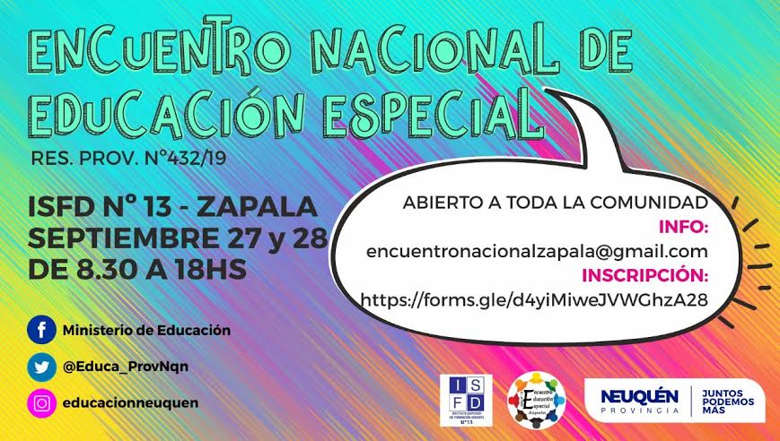 Zapala será sede del Primer Encuentro Nacional de Educación Especial19 de septiembre de 2019Organizado por el Instituto Superior de Formación Docente (ISFD) N°13 y el acompañamiento del Consejo Provincial de Educación (CPE), la jornada contará con disertantes que abrirán el diálogo en base a conocimientos científicos y académicos sobre la temática.Los días 27 y 28 de septiembre en el Cine Teatro “Amado Sapag” de la ciudad de Zapala se llevará a cabo el primer Encuentro Nacional de Educación Especial destinado a docentes, estudiantes, profesionales, instituciones y público en general, donde el diálogo apunta al intercambio de conocimientos científicos y académicos sobre la educación especial.La ministra de Educación y presidenta del Consejo Provincial de Educación (CPE), Cristina Storioni destacó el encuentro como la oportunidad para dialogar y pensar nuevas herramientas y formatos que fortalezcan la educación inclusiva. “Será una jornada donde encontraremos el aporte de diferentes miradas y experiencias que se compartirán desde los distintos paneles”, expresó la titular de la cartera educativa.Algunos de los temas que serán puestos en la mesa de esta gran jornada apuntan al abordaje de la discapacidad y las políticas estatales, el derecho a la inclusión, la atención temprana en el desarrollo infantil, la formación en la práctica y la educación inclusiva.La iniciativa es acompañada por el Consejo Provincial de Educación (CPE), a través de la Dirección Provincial de Educación Superior y organizada por el Instituto Superior de Formación Docente (ISFD) N°13, en la que se trabajará con diferentes paneles de disertantes.En esta oportunidad, se contará con la presencia de las y los disertantes Prof. Julieta Álzaga (Cutral Có); Prof. Liliana Briatore (La Plata); Prof. Claudia Cavallero (San Luis); Prof. Soledad Dediego (Cutral Có); Lic. Marhild Cortese (Río Cuarto); Dr. David Rodríguez (Cutral Có); Arq. Alberto Ciampini (Neuquén); Prof. Elizabeth Tobares (Córdoba); Lic. Ana Chiapero (Córdoba); Prof. Rafael De Piano (Buenos Aires); y referentes de la subsecretaría de Discapacidad del Neuquén. Además cerrarán el encuentro la Directora Provincial de Educación Superior, Graciela Viard y la Directora General Modalidad Educación Especial, Jadra Jadull.El encuentro tendrá lugar el próximo viernes 27 y el sábado 28 de septiembre, de 8.30 a 18hs, en el Teatro “Amado Sapag” de la ciudad de Zapala.Las y los interesados en participar podrán inscribirse a través del formulario: https://forms.gle/d4yiMiweJVWGhzA28.Para más información podrán escribir al correo de mail: enucentronacionalzapala@gmail.com